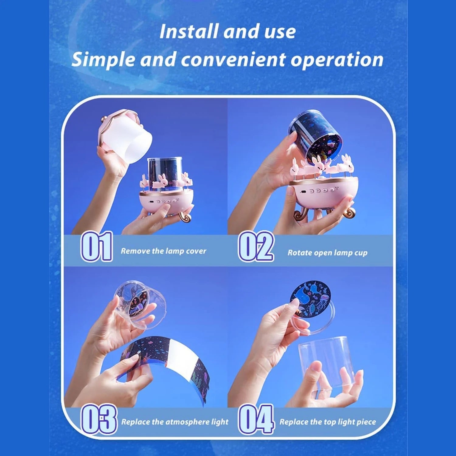 Transform your child’s room into a dreamy starry paradise with the Bunny’s Carousel Night Light Projector. This charming projector features adorable bunny figures rotating in a carousel, bathed in soft LED lights that create a mesmerizing sky full of stars and moonson walls and ceilings.